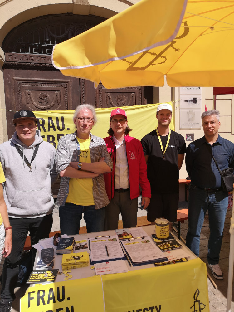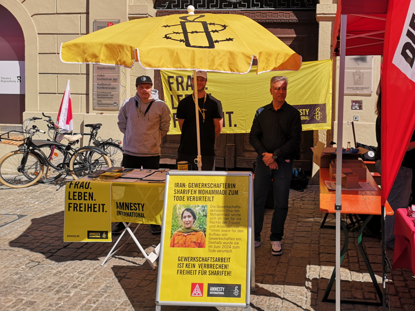 Wir sind mit einem Infostand bei Maikundgebung des DGB am Haiplatz vertreten und sammeln Unterschriften für die iranische Gewerkschaftsaktivistin Sharifeh Mohammadi Sie setzte sich im Iran für die Rechte der Frauen und Arbeitnehmer*innen sowie für den Aufbau von Gewerkschaften ein. Deshalb wurde sie im Juni 2024 zum Tode verurteilt. Nach internationalen Protesten wurde das Urteil im Oktober aufgehoben. Doch am 13. Februar 2025 wurde nach einem Prozess, der rechtstaatliche Grundsätze grob missachtete, erneut das Todesurteil gegen sie verhängt!