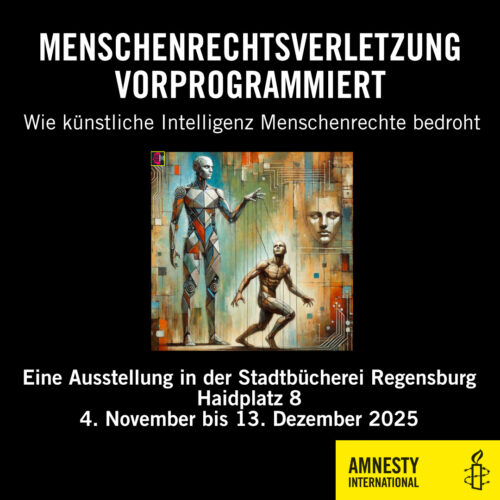 Amnesty International lädt in dieser Ausstellung ein, einen Blick auf die Gefahren und Chancen der künstlichen Intelligenz für die Menschenrechte zu werfen. Dabei wurden zu der Erstellung von Inhalten auch Künstliche Intelligenz wie ChatGPT und DALLE verwendet.